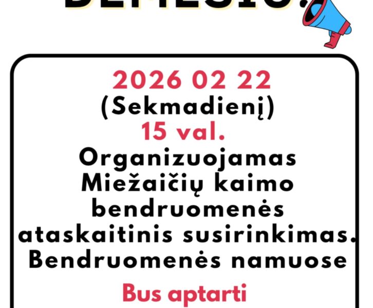 2026m. Vasario 22d. (Sekmadienį ) 15:00 val. Miežaičių kaimo bendruomenės namuose vyks ataskaitinis susirinkimas (Dalyvavimas būtinas).